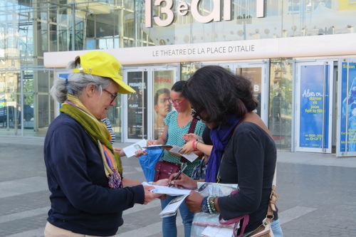 Quand elle a appris que le Falun Dafa était enseigné gratuitement, elle a loué cette générosité en disant : « Merci pour tout ce que vous faites! » Voyant des personnes de tous âges pratiquer, y compris certaines âgées de plus de 80 ans, elle a voulu se joindre à elles. « Les gens ne sont pas au courant. Nous devons faire en sorte que tout le monde pratique avec vous. » Elle s’est dite ravie d’avoir découvert le Falun Dafa et a demandé l’adresse et les coordonnées du point de pratique à Paris.