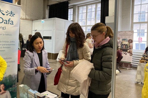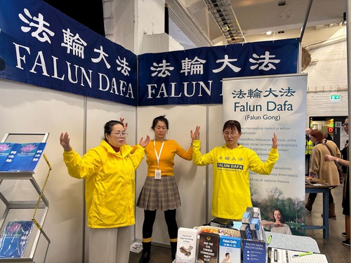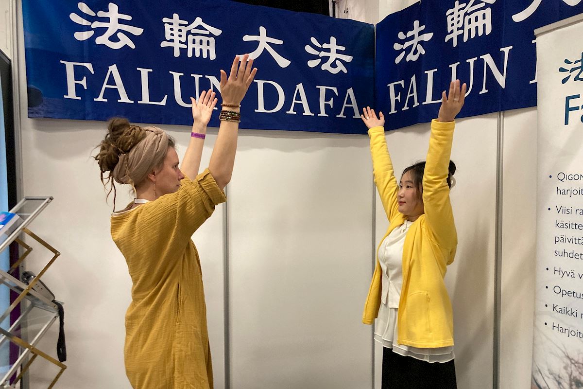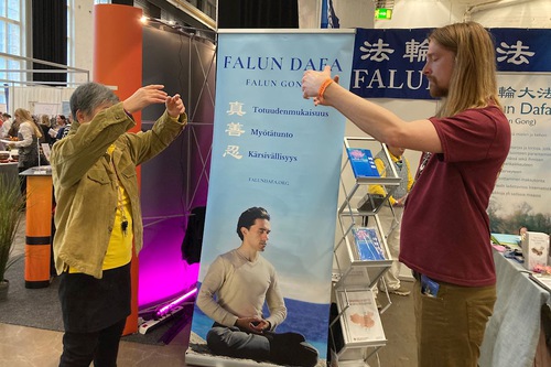 L'organisme hôte avait prévu une séance d'une heure pour l'Association finlandaise de Falun Dafa, et plus de dix personnes ont appris les exercices. Parmi elles, un membre du personnel chargé de l'accueil. Il a ensuite déclaré avoir ressenti une énergie circuler dans ses bras et le haut de son corps.