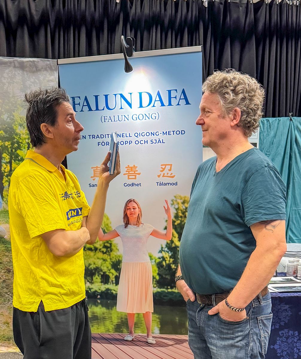 « J'ai rencontré beaucoup de jeunes, dont deux étaient d'Uppsala" a déclaré Minh, d'Uppsala. "Quand j'ai mentionné le Falun Dafa, ils ont été aussitôt intéressés. Je leur ai parlé du cours en ligne mais ils ont dit qu'ils iraient sur le site de pratique de groupe pour apprendre les exercices. Je leur ai donc donné les coordonnées du site de pratique local. "
