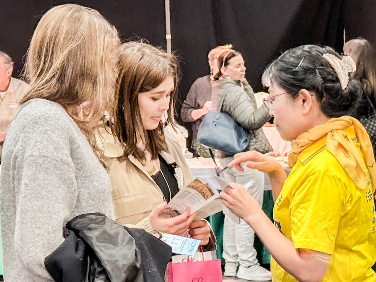 De nombreuses personnes se sont arrêtés pour discuter avec les pratiquants. Certaines demandaient où elles pouvaient apprendre la pratique ou s'inscrivaient à la séance d'apprentissage gratuite, d'autres achetaient les livres de Dafa. De jeunes visiteurs ont apprécié d'apprendre l'existence de cours en ligne. Un jeune homme a acheté le livre Falun Gong .