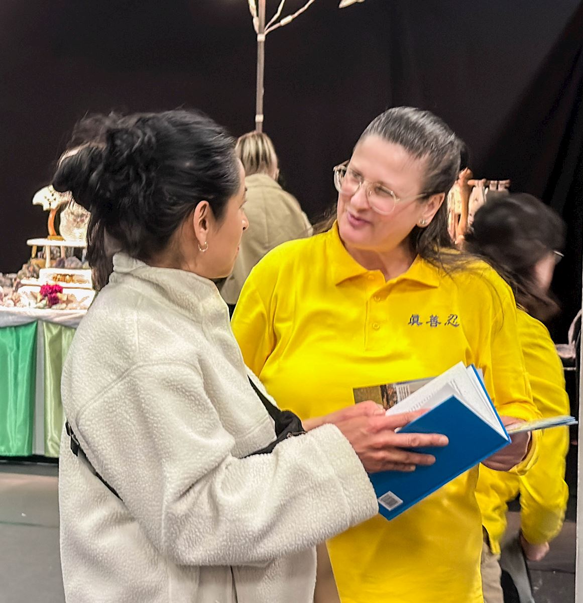 Biljana (à droite) présente le Falun Dafa à un visiteur.