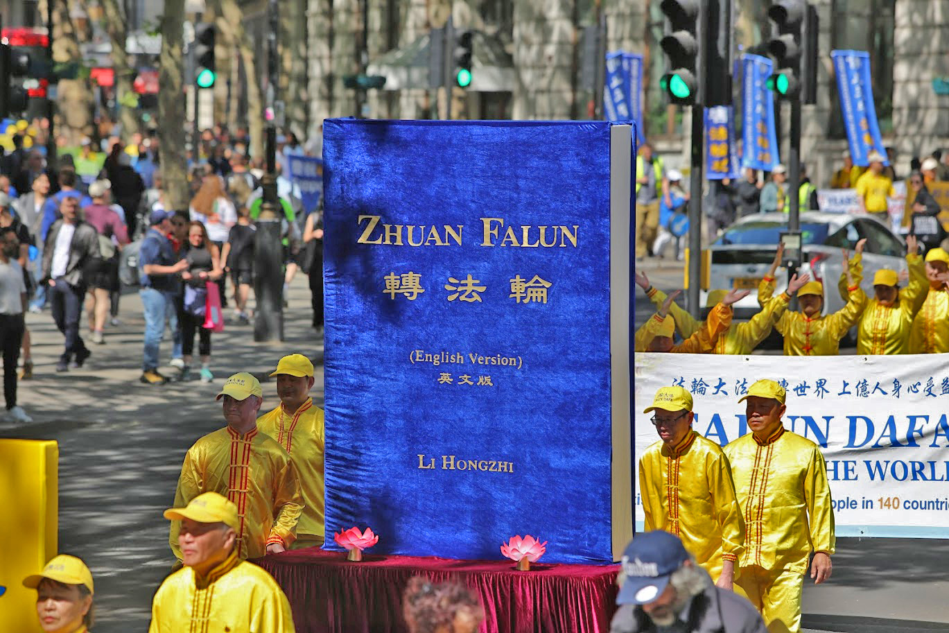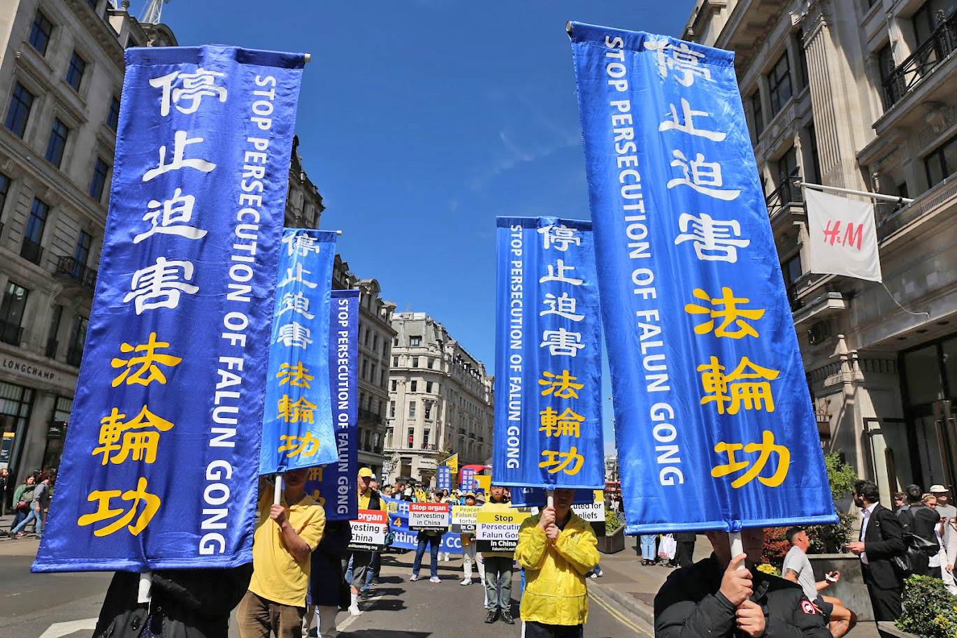On pouvait lire sur les grands banderoles brandies par les pratiquants « Falun Dafa est grand » et « Stop à la persécution du Falun Gong ».