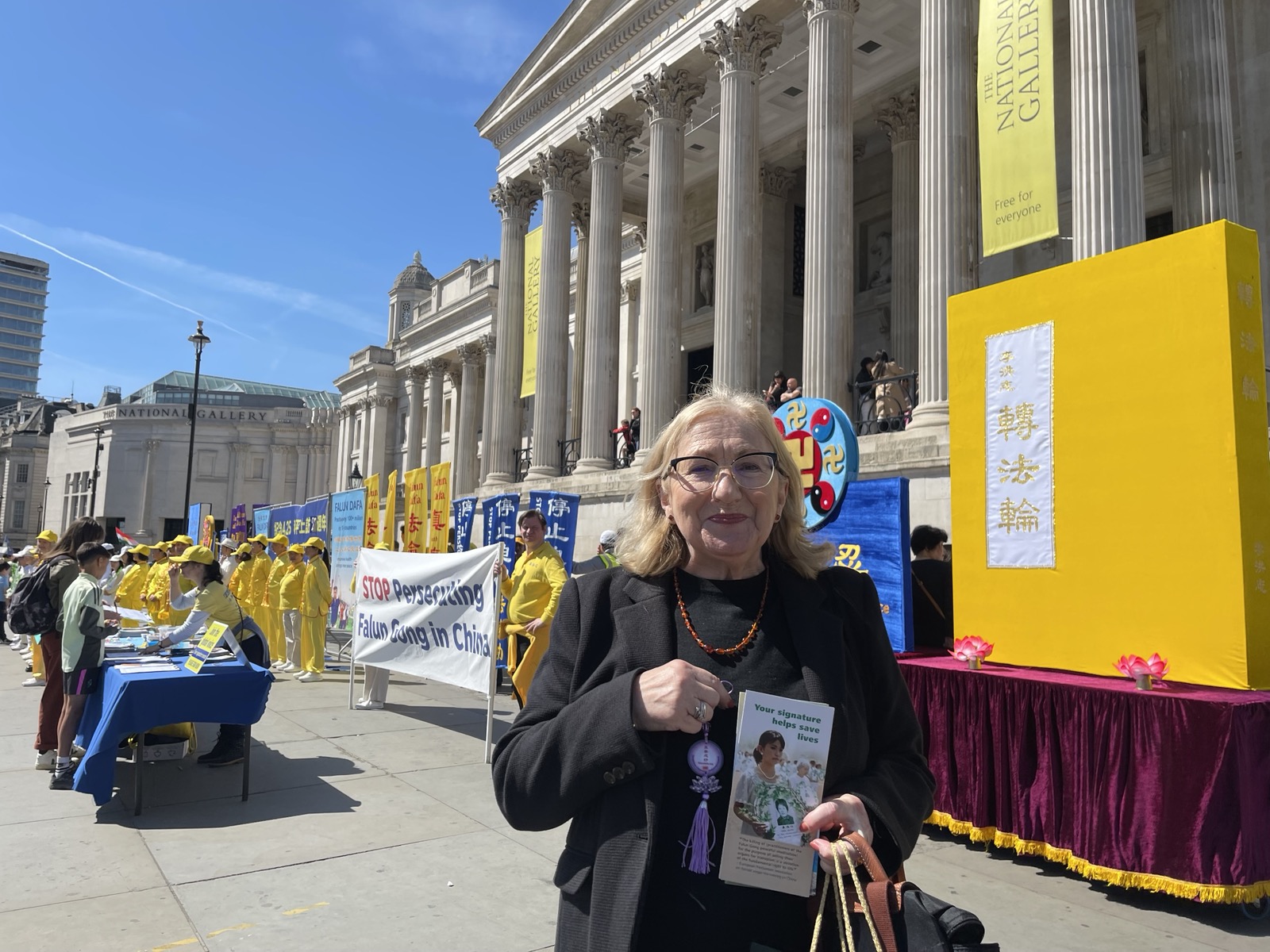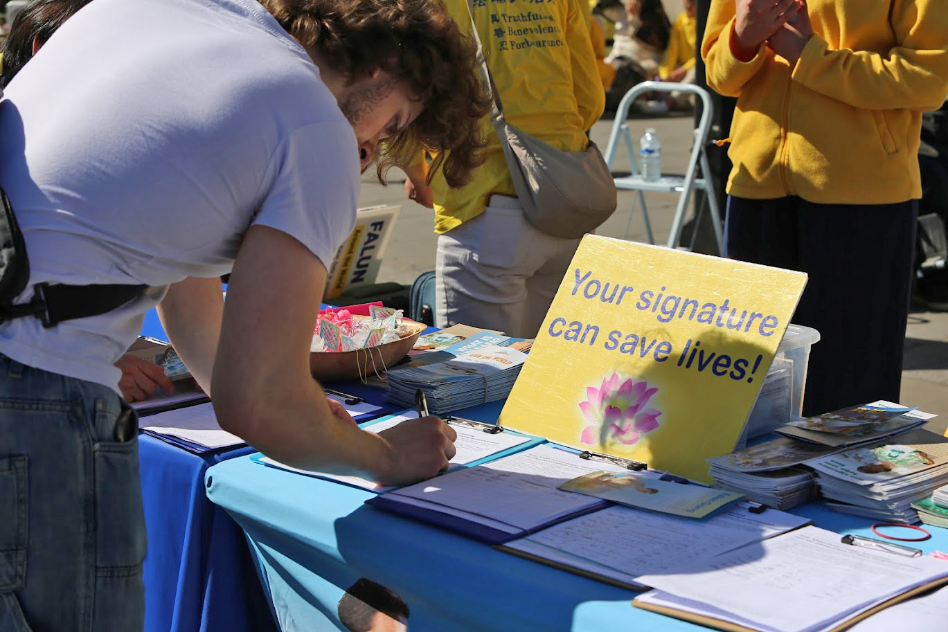 Après avoir signé la pétition, Mme Lim a déclaré : « Les couleurs jaune vif sont très attrayantes et attirent l'attention. Les difficultés endurées par les pratiquants doivent être rendues publiques. »