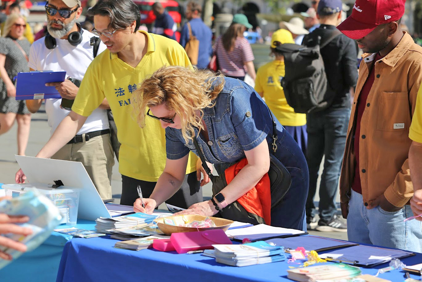 *Des passants signent la pétition pour demander la fin des violations des droits de l'homme visant les pratiquants de Falun Gong.
