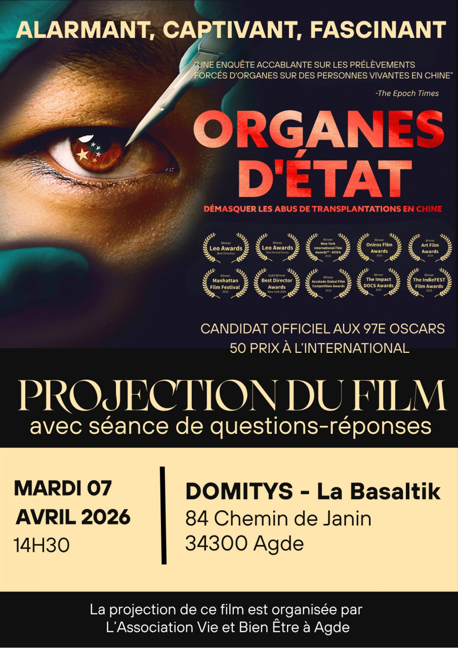 Mardi 7 avril 2026, la résidence services seniors Domitys – La Basaltik à Agde a accueilli la projection du documentaire « Organes d’État », un film aussi poignant que dérangeant. Du début à la fin, le silence et l’attention étaient palpables. Certains spectateurs, visiblement bouleversés, n’ont pu retenir leurs larmes ... -