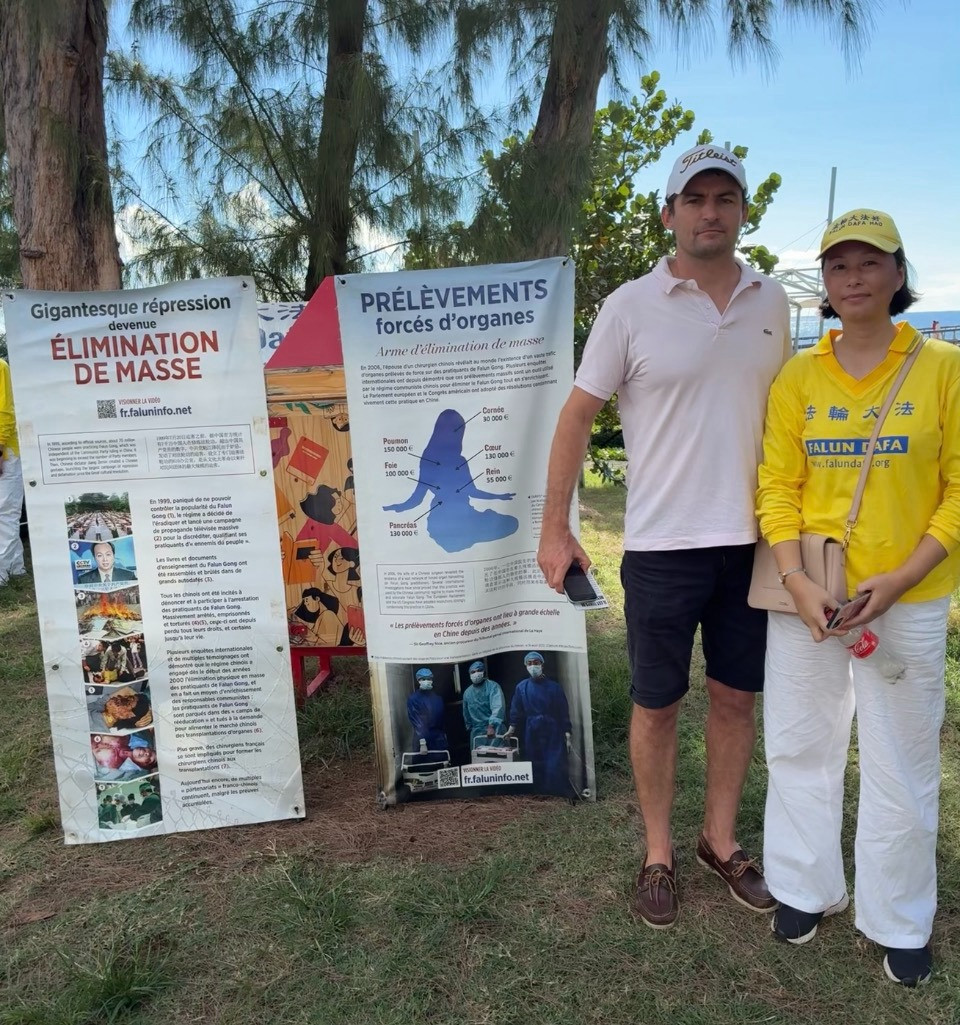 L'un des moments les plus marquants de cette journée fut la rencontre entre un kinésithérapeute réunionnais et Mme Luo Juan, pratiquante de Falun Gong ayant survécu à six années d'emprisonnement dans la province du Hunan, et fuit la persécution en Chine. D'abord incrédule, l'homme visiblement ému a remercié chaleureusement l'ensemble des pratiquants présents et a emporté des documents d'information afin de les mettre à disposition de ses patients dans son cabinet ... . -