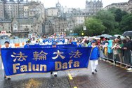 Le 5, aout, 2007 a eu lieu le grand défilé annuel du festival d’ Edinbourg. Selon les reportages, 50’000 spectateurs ont assisté au spectacle, sous la pluie. En debut de cortège, des banderoles annonçaient “ Falun Dafa” et “ Zhen-Shen-Ren” en anglais et chinois, suivies de la Fanfare divine europeenne, composée de plus de cent dix pratiquants. La musique de Dafa qu'ils ont interprétée a touché les coeurs et purifié les esprits. -