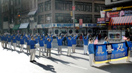 Chaque année le 11 novembre le défilé de la Journée des Vétérans descend la célèbre Cinquième Avenue de Manhattan, New York City. Depuis 2005, le cortège de Falun Gong a été l'une des stars du défilé. Cette année, 153 groupes participaient, et le groupe assigné à la dernière position—le grand final du défilé--était le Falun Gong avec sa section de tambours de taille, la démonstration des exercices, et l'équipe de danse.Lorsque le cortège du Falun Gong est arrivé à la plate-forme principale, le commentateur a annoncé : "Nous vous souhaitons la bienvenue, Falun Dafa. Nous vous souhaitons la bienvenue ici." -